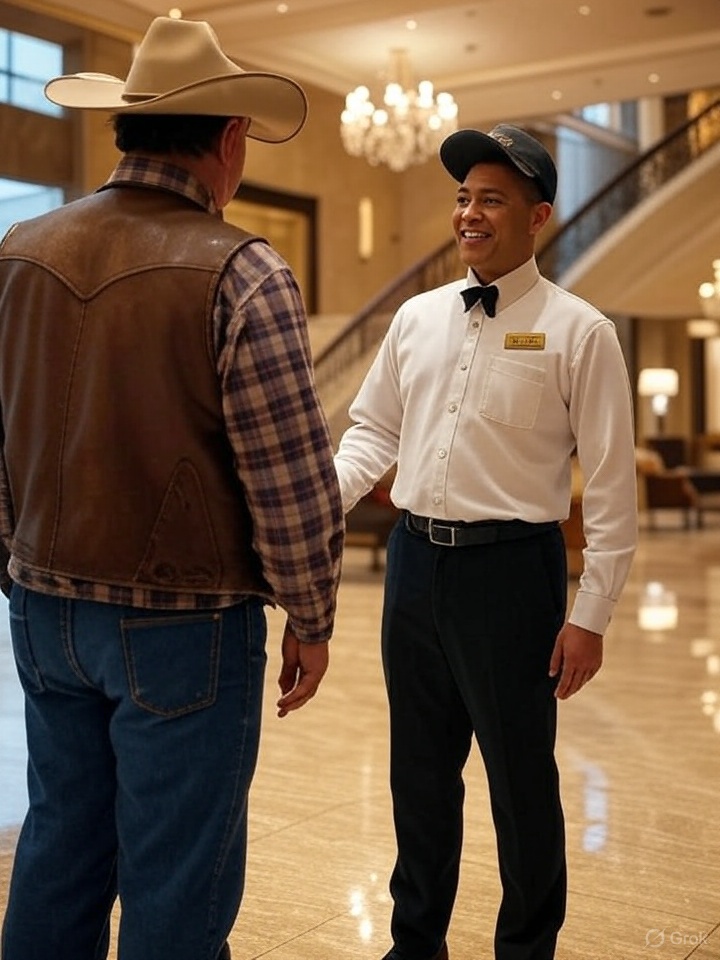 - Shaking head fast: When Sarah offers a new room with bellboy help, he shakes his head quickly. This is a clear sign he says “no” without words. It shows he is stubborn and only wants his current room fixed. He does not care about other options, even if moving is made easy. The fast shake shows he is impatient and upset, feeling the hotel has done something wrong.