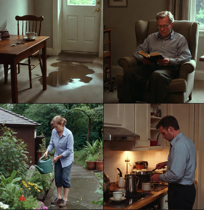 - Lily: outside watering flowers, shoes wet → she went outside, near the door/puddle.