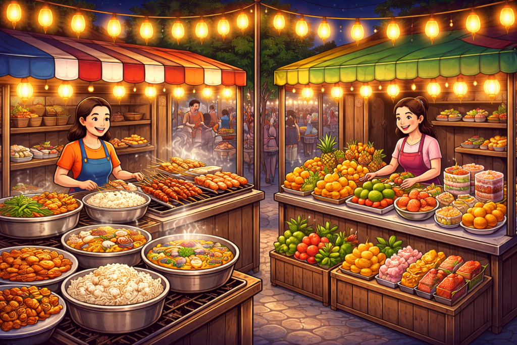 - People sell rice, fried noodles, soup, grilled meat, chicken, fish, sweet desserts, and fresh fruit.