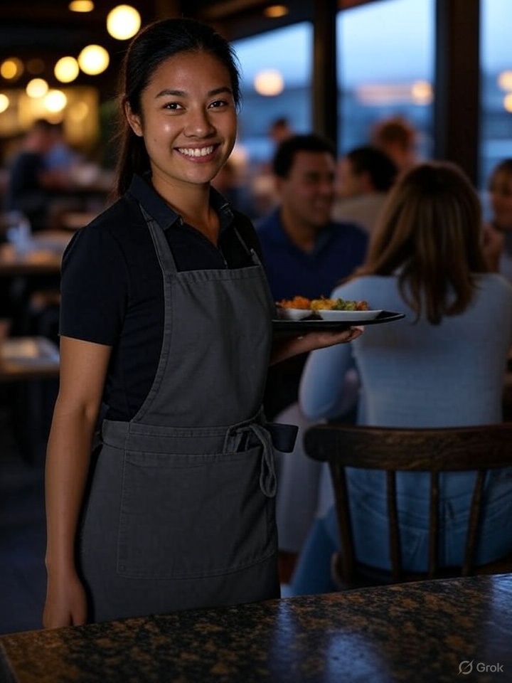 A waitress is always friendly. She greets guests with a smile and makes them feel welcome. Smiling shows respect and kindness.