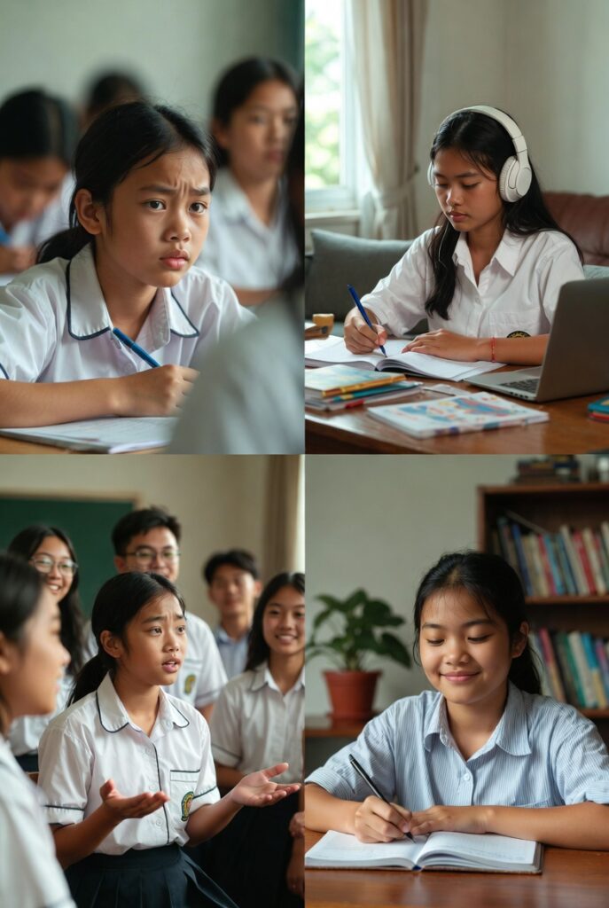 Every day, Oum studies English at home and at school. She listens carefully in class and practices speaking with her classmates. She reads simple English books and listens to English songs. Sometimes, she watches videos in English to learn new words. She also writes small texts in English to practice. Oum knows that learning a new language takes time and patience, and she is ready to work hard.