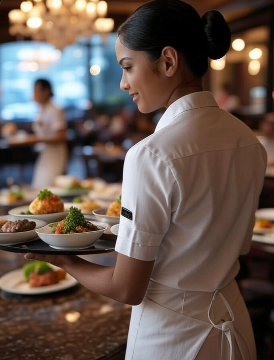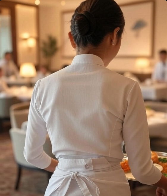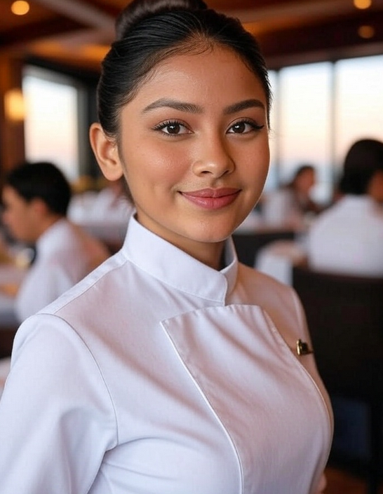 Her name is Rathana. She is 22 years old. She works as the head waitress at Kroya restaurant in Siem Reap. Every day, she gets ready and goes to the restaurant. When she arrives, she checks the tables and chairs to make sure they are clean. She talks to the chef and the other waiters. She gives jobs to the waiters and helps them prepare. When guests come, she smiles and shows them to their tables. She takes their orders and checks if they like their food. After the first meal, she eats lunch with her team. She feels happy and proud when her work is finished.