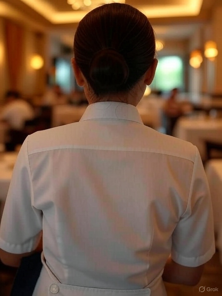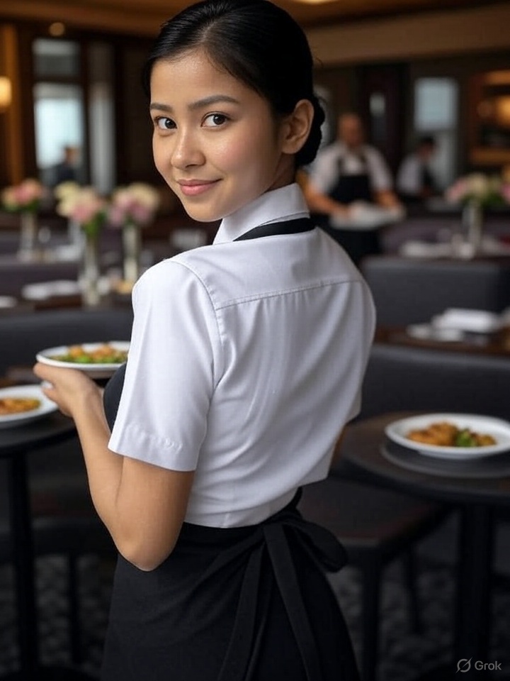 Her name is Rathana. She is 22 years old. She works as the head waitress in a restaurant in Siem Reap. Every day, she gets ready and goes to work. When she arrives, she checks the tables and chairs. She makes sure they are clean and nice. She talks to the chef about the food. She also talks to the waiters. She gives them jobs and helps them. When guests come, she smiles and shows them to their tables. She takes their orders and answers questions. After the first meal, she eats lunch and rests. Then she helps again. She feels happy and proud at the end of the day.