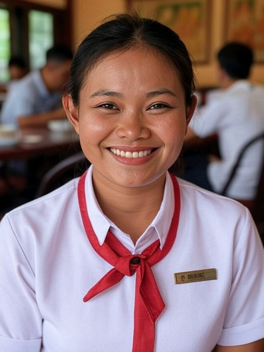 My name is Channary, and I work as a waitress in a small restaurant. Every day I try to be a perfect waitress. I always wake up early in the morning, because I want to be ready and not feel stressed. First, I eat breakfast and check my uniform. It must be clean and nice, so the guests feel good when they see me.