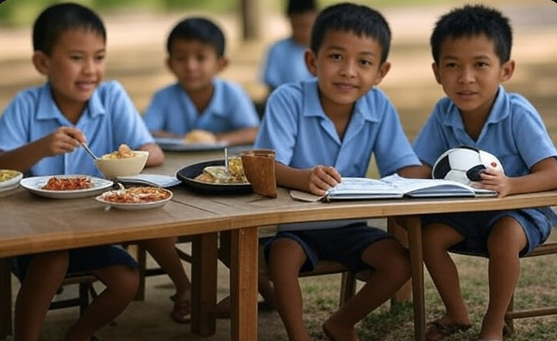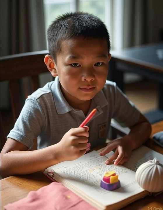 He wakes up at seven o’clock. He eats breakfast, usually cereal with milk. Then, he brushes his teeth and gets dressed for school. School starts at half past eight. He has lessons like maths, English, and science. His favourite subject is art.