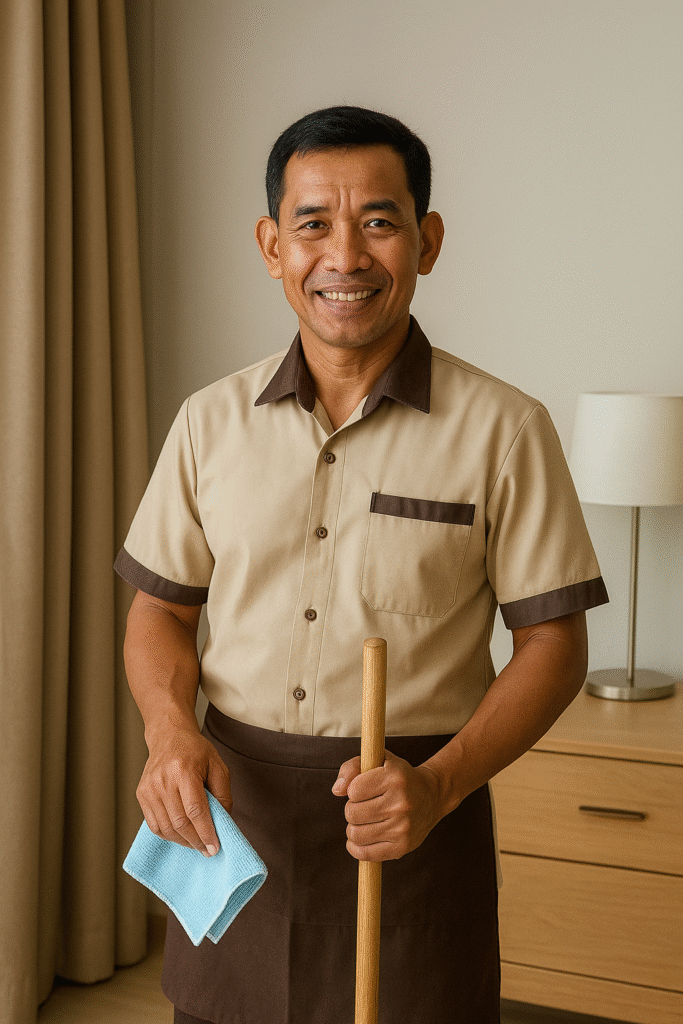 He is a housekeeper in a hotel. He makes the hotel clean and nice. He checks the bed, the floor, and the bathroom. He is careful and fast. He lifts towels and moves things. He is reliable and comes to work every day. He is polite and speaks nicely to guests. He works well with other staff and helps them. Teamwork makes the hotel better.