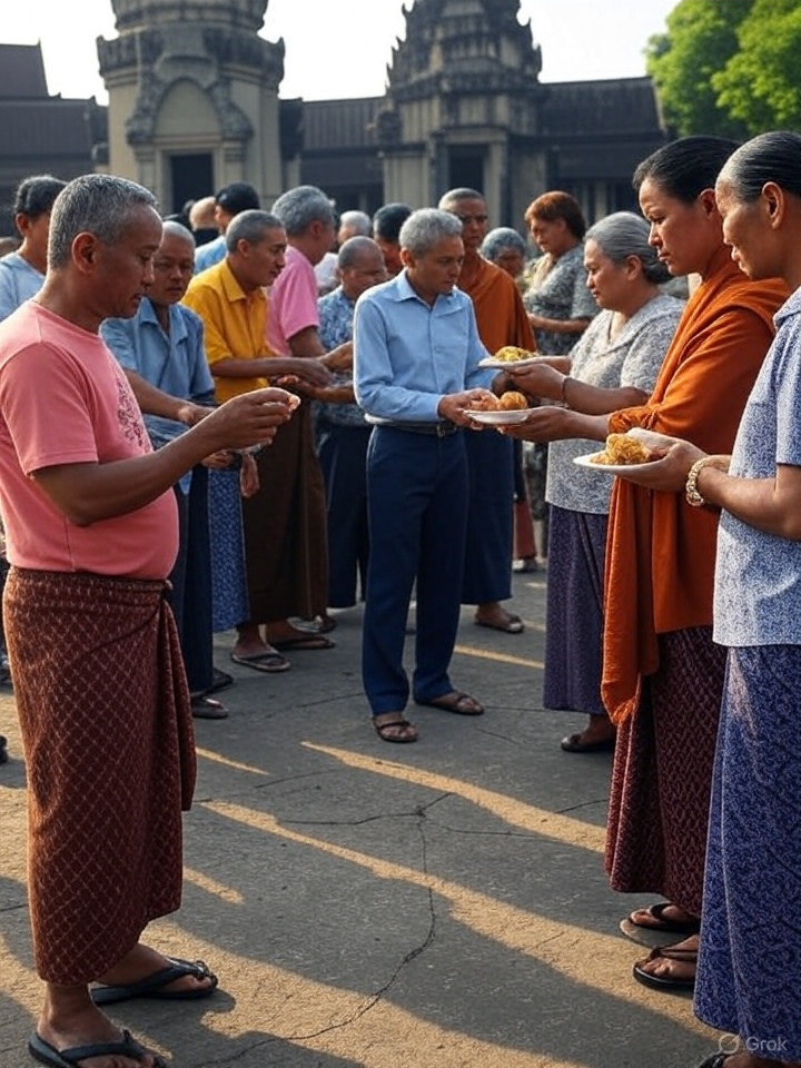 The most important day is the 15th day, called „Pchum Ben.“ On this day, people gather at pagodas to perform special prayers and give food to the monks. This is done to show respect for their ancestors and to help them find peace in the spirit world. According to Cambodian belief, the spirits of the dead can visit the living during this time, and the offerings of food help nourish them.