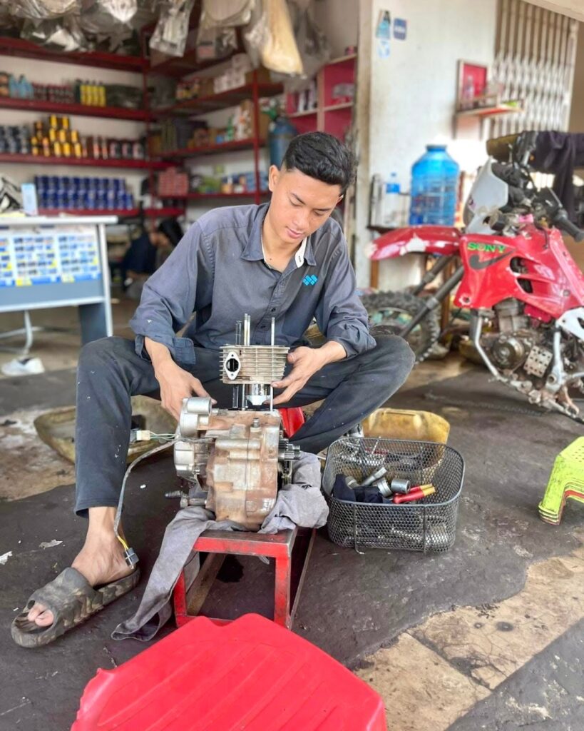 Meet Bunseng, a young man from Bakong. His father died, so he had to take care of his grandmother and younger brother. He trained in motorbike repair and found work in Siem Reap. His dream was to open his own repair shop at home, so he could support his brother in school. Thanks to the Shinta Mani Foundation’s Business Loan Programme, his dream came true. Now, he runs his own shop, earns a good income, and cares for his family.