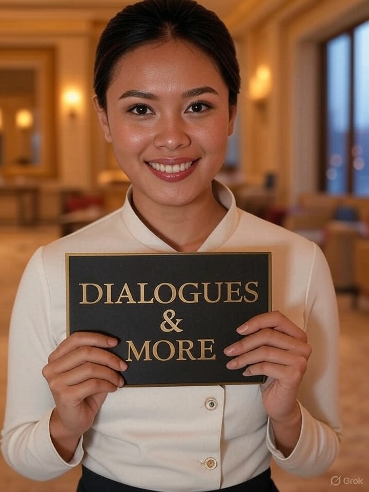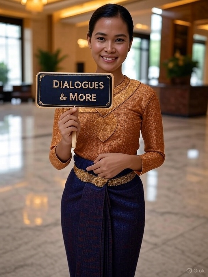 In a restaurant, staff greet guests politely and guide them to their table. They offer menus, drinks, and explain dishes clearly. Popular Khmer dishes include Fish Amok (steamed fish with coconut milk), Beef Lok Lak (stir-fried beef with vegetables and rice), and Khmer Curry (mild chicken or vegetable curry). Staff recommend dishes, ask about allergies or preferences, and confirm orders. During the meal, they check if everything is okay and respond to requests. After the meal, staff offer desserts or coffee, clear plates, and suggest popular sweets like Banana with Sticky Rice. Finally, they present the bill, ask about cash or card payment, thank the guest, and invite them to return. Polite phrases ensure smooth service and a positive experience.