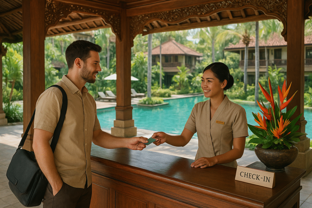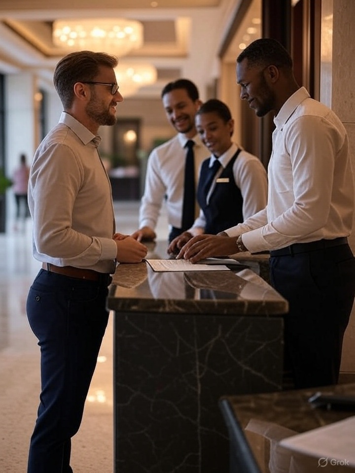 Guests are escorted to reception or a lounge for check-in. Passport or ID is collected, and booking details like room type, dates, and preferences are confirmed. Staff explain hotel facilities and services, and secure payment or a deposit smoothly.