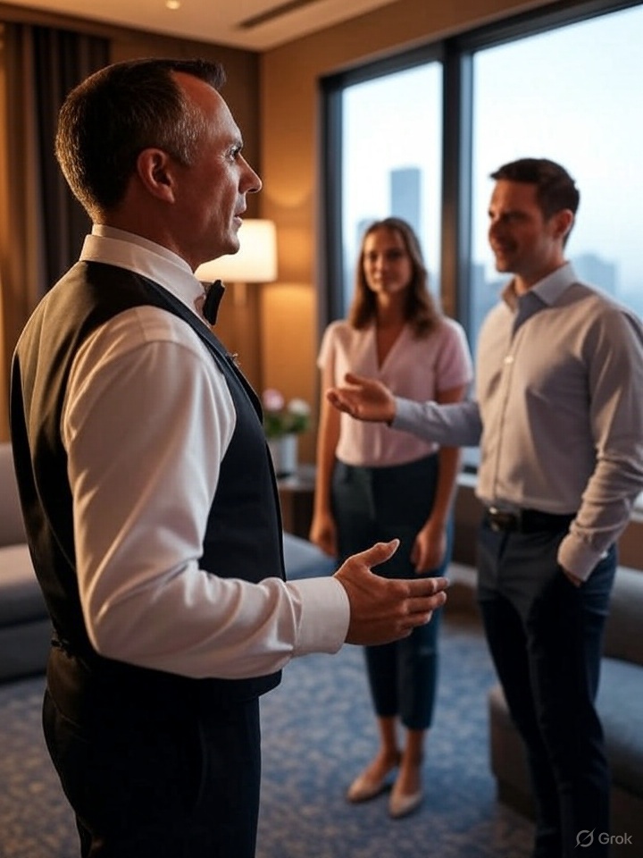 A staff member escorts the guest to the room, carrying luggage. On the way, they may point out key facilities like the restaurant, pool, or spa. In the room, staff show the main features and any special amenities, then ask if anything else is needed before politely leaving.