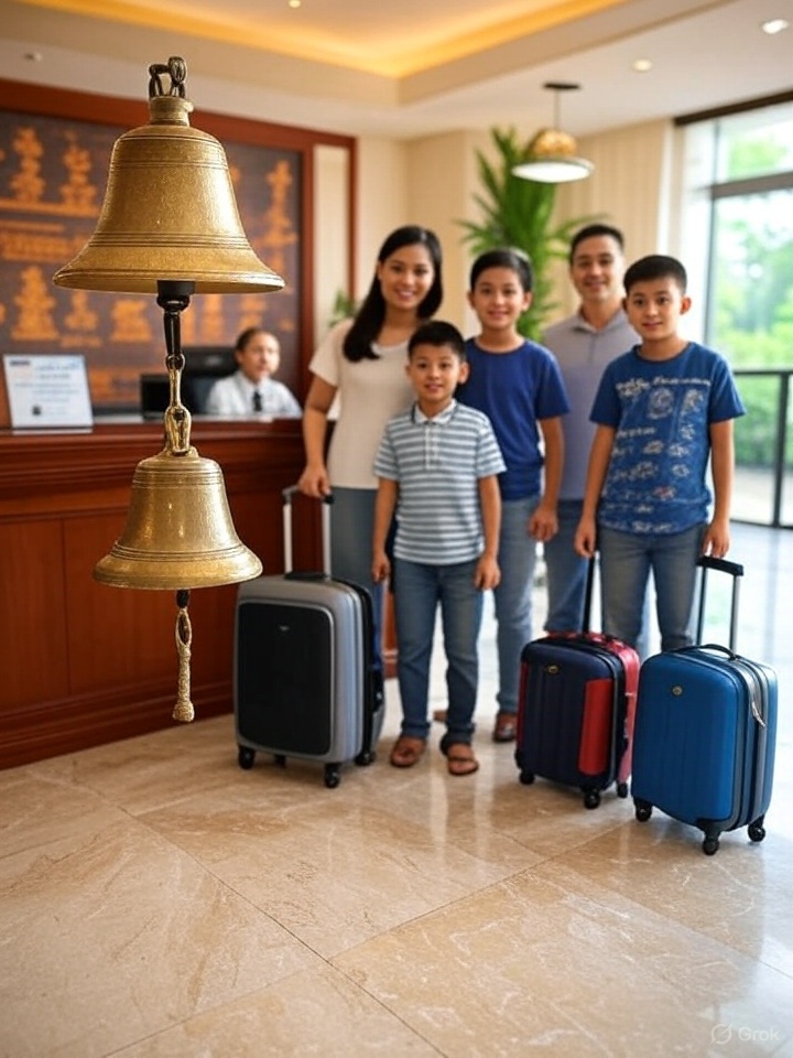 The family asks for help with their luggage. The receptionist calls a bellboy, who arrives quickly and carries the bags to the taxi waiting at the main entrance.