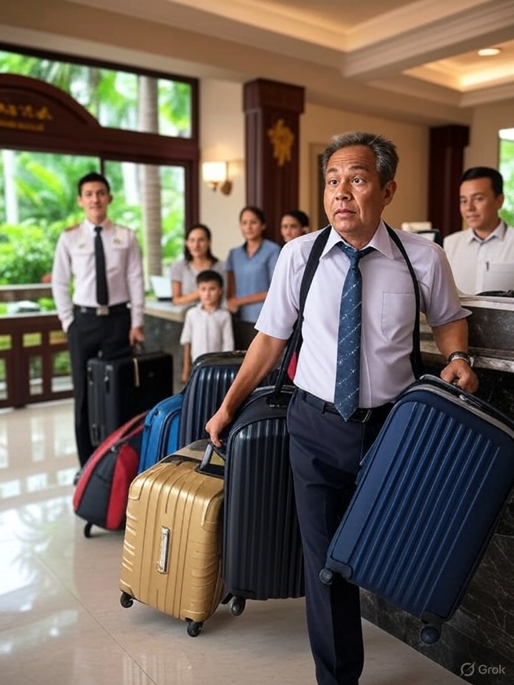 The bellboy arrives late, and the taxi isn’t waiting at the main entrance. The family finally leaves feeling frustrated, carrying their luggage themselves.