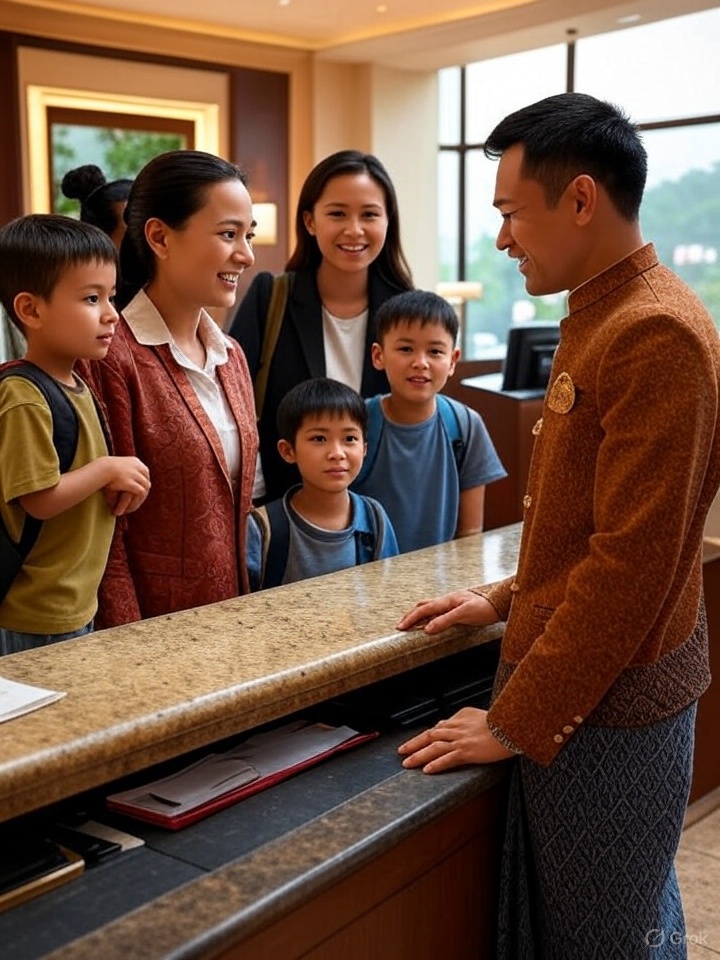 Scene: Morning at Sunshine Hotel. Guests are arriving and asking questions.