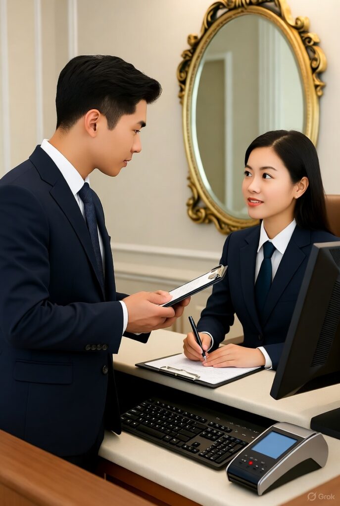 | 6. Effective Use of Tools | Use the hotel software (PMS) to write notes and check information: Enter: “Room 410 cleaned and ready.” / “Guest requested wake-up call at 7 AM.”Use internal messaging to talk to housekeeping, maintenance, or concierge: “Housekeeping, room 502 ready?” / “Maintenance, AC fixed in room 305?”Always update the system so everyone knows the latest information: After fixing a problem: “Room 305 AC fixed.” / “Guest late arrival updated in PMS.”Double-check details to avoid mistakes: Check guest request list before arrival / Verify VIP amenities before guest check-in. |