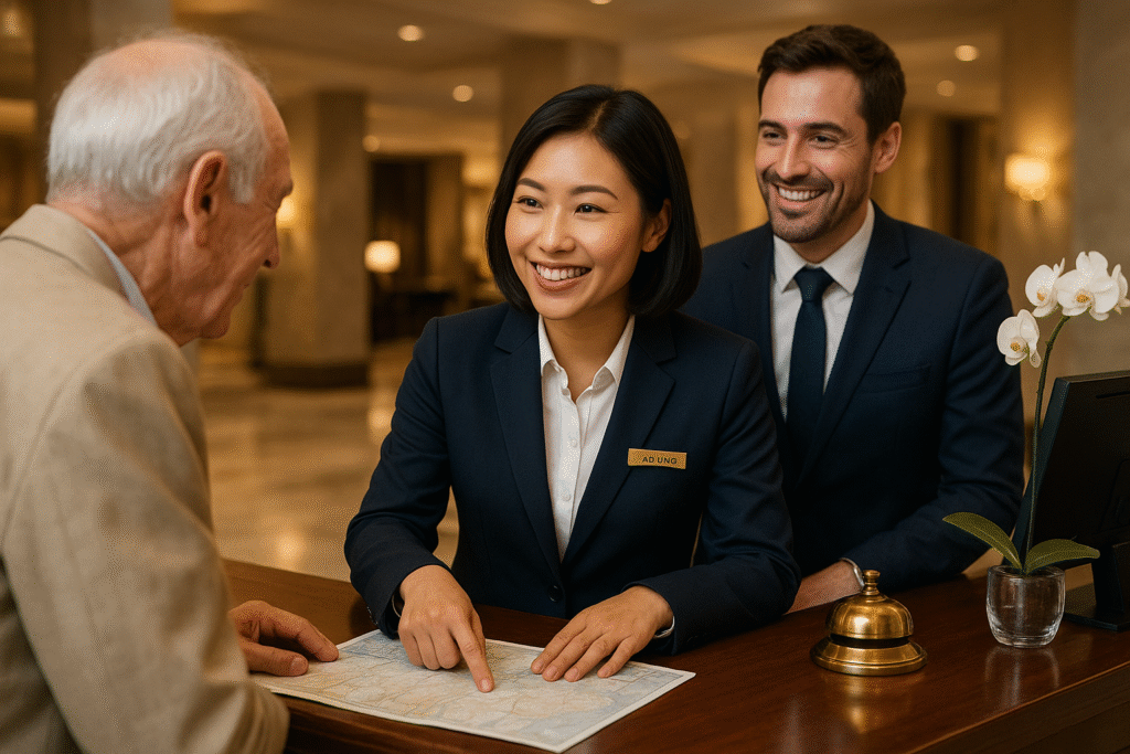→ Uniforms make staff look professional and easy to recognize. A clean and ironed uniform shows pride in the job and gives guests trust in the hotel’s quality. - Speak clearly and politely