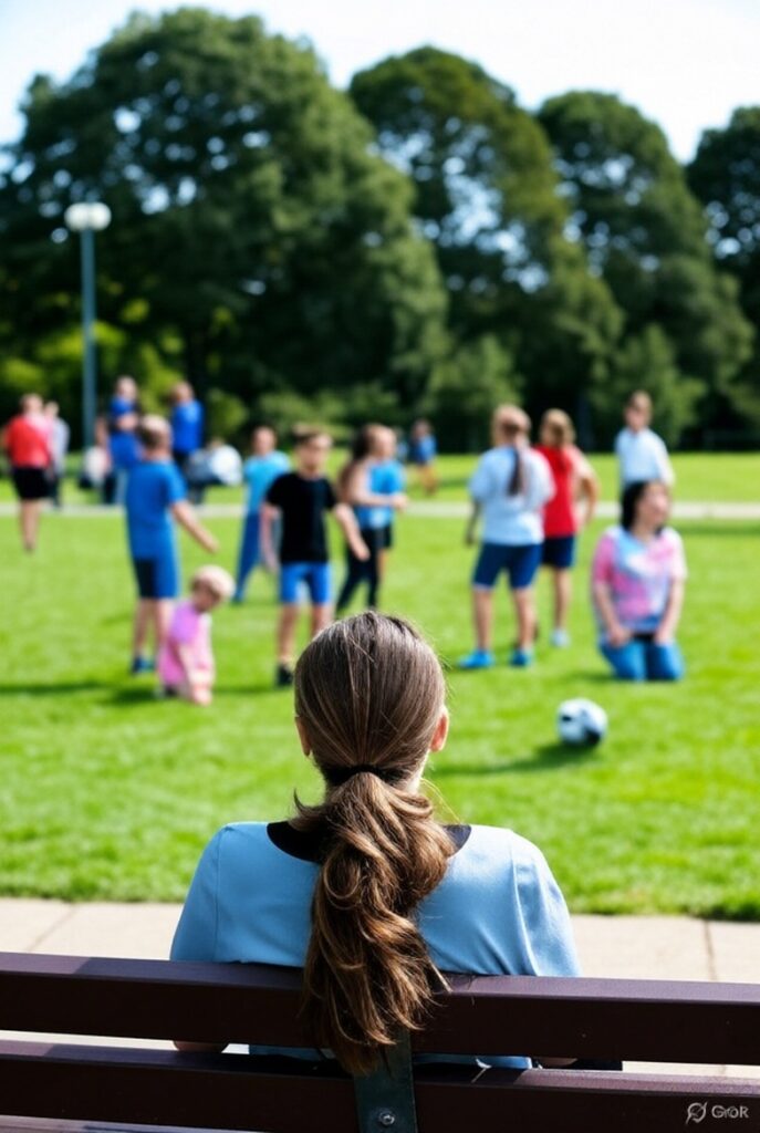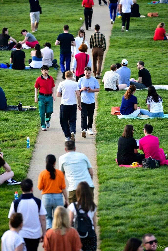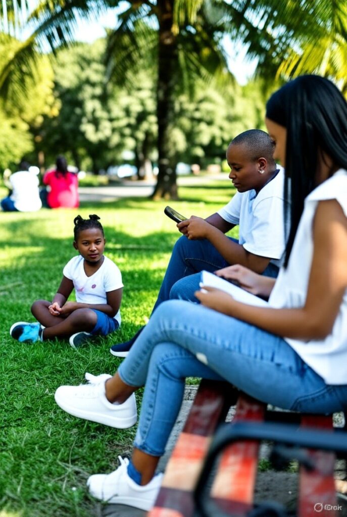 The people are sitting in a park. The sun is shining and the grass is very green. A little girl is sitting on the grass. She is wearing a white T-shirt and blue shorts. She is looking at the other people. A man is sitting next to her. He is looking at his phone. A woman is sitting on a bench. She is holding a notebook. The people are relaxing and are enjoying the nice day. Other people are sitting in the background. Everyone is happy and calm.