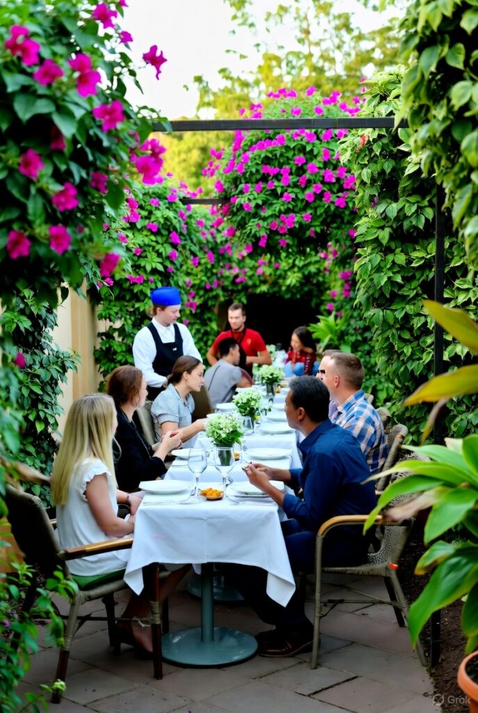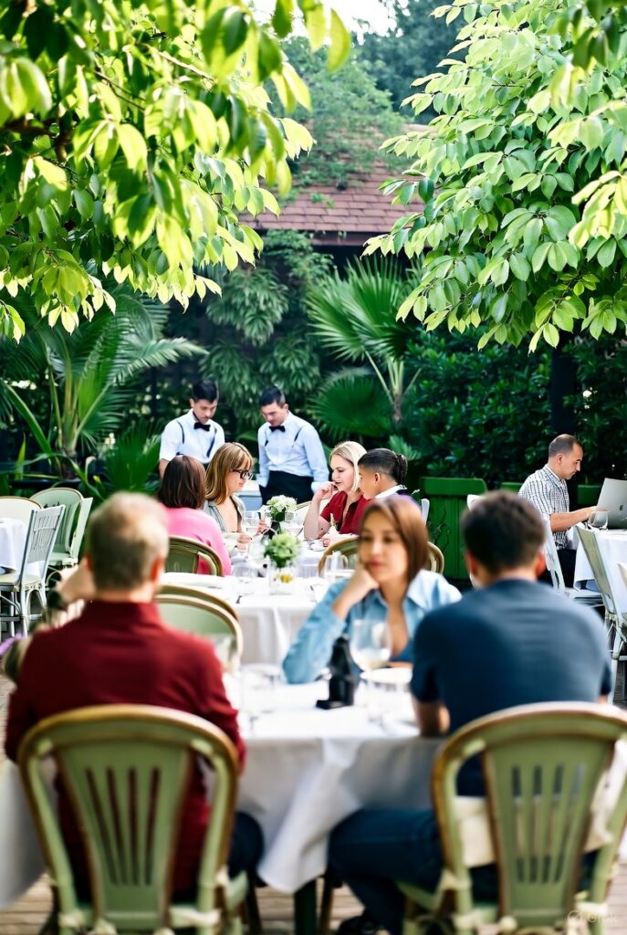 People are eating now. They are sitting at tables. The tables are outside. Green trees are around them. Waiters are standing and helping. One waiter is talking to people. Girls are drinking and talking. A man is using a laptop. Everyone is enjoying the food. The sun is shining. Flowers are on the tables. It is a happy time. People are smiling and eating. The place is beautiful and green.
