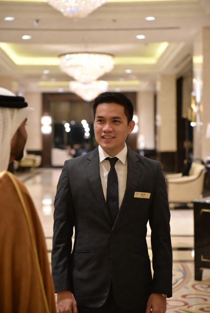The manager explained his job. Arun helped hotel guests, answered questions, and made them happy. He helped a family find a good restaurant and called a taxi for them. Later, he gave a map to two tourists and told them about a temple to visit. They thanked him and smiled. Arun felt proud.