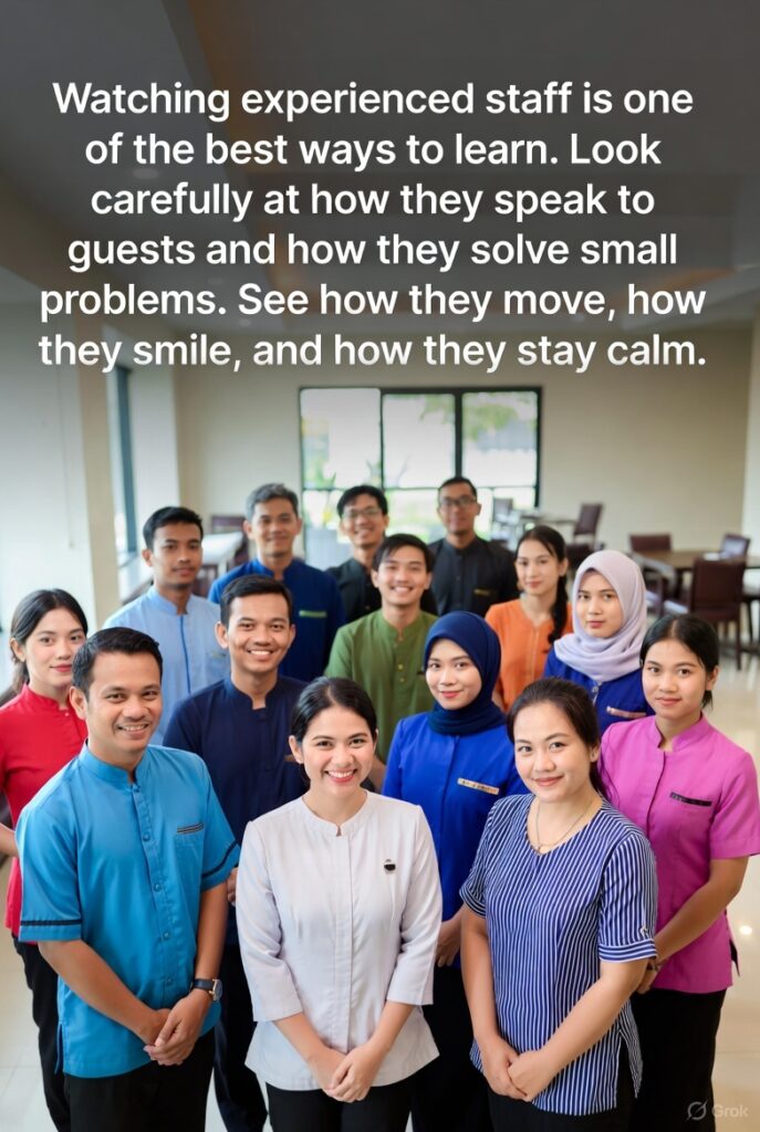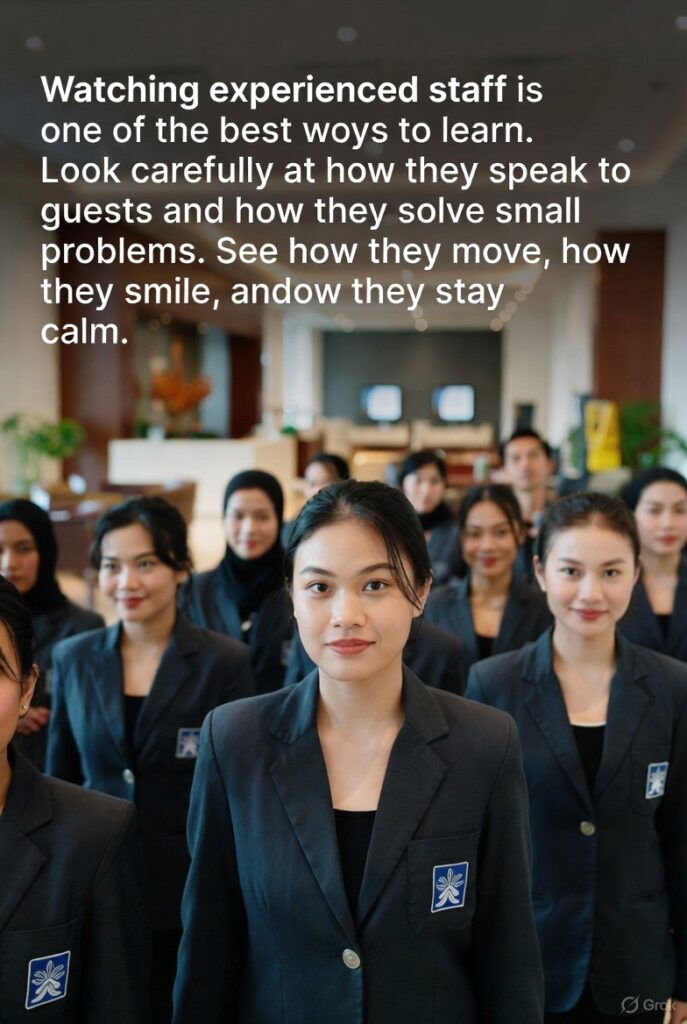 Watching experienced staff is one of the best ways to learn. Look carefully at how they speak to guests and how they solve small problems. See how they move, how they smile, and how they stay calm. You can learn good habits from them. If you do not understand something, ask a simple question. Most senior staff are happy to help you. Asking questions shows that you are interested in learning. You can say, βCan you show me, please?β or βHow do you do this?β This is polite and helps you learn faster. Always listen to their advice. By observing and asking, you will soon know how to work well and become more confident in your job.