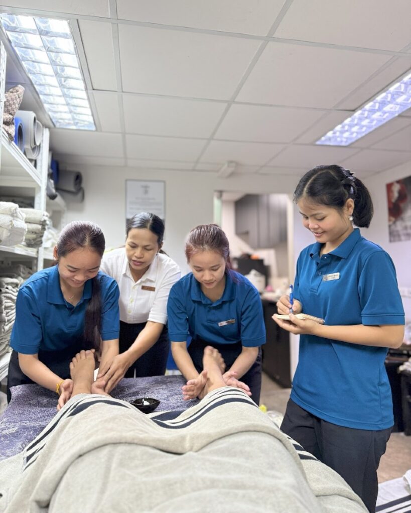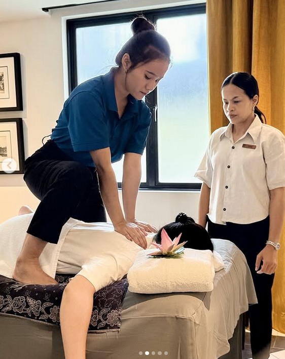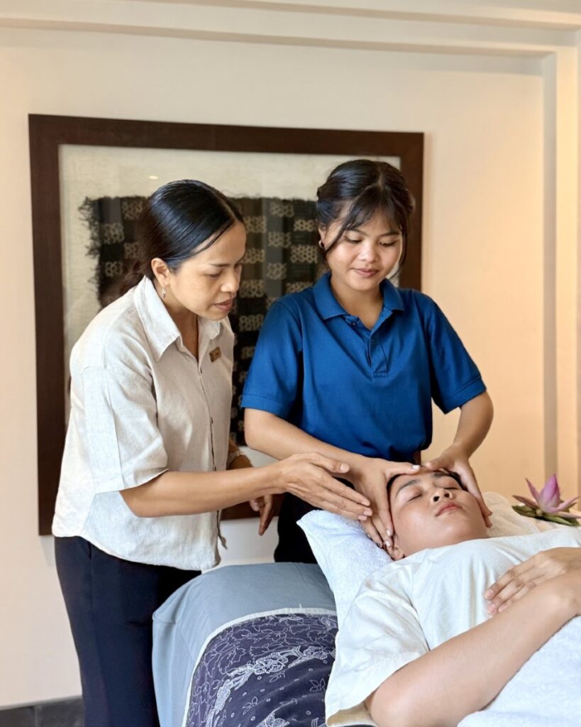 At the Shinta Mani Angkor spa, young students take part in special classes to learn spa treatments step by step. In their training, they study different types of massages, such as relaxing body massages and foot massages. They also learn how to use oils and creams correctly to help guests feel calm and refreshed.