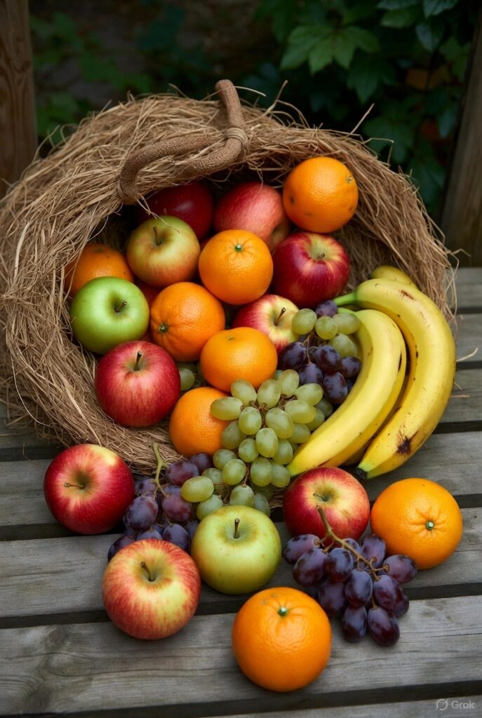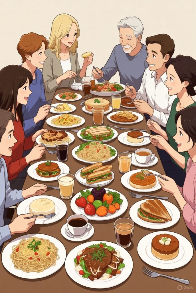 Today I eat breakfast. I drink milk. I eat an egg and bread. For lunch, I eat chicken and rice. I drink orange juice. For dinner, I eat soup and noodles. I like fruit: an apple and grapes.