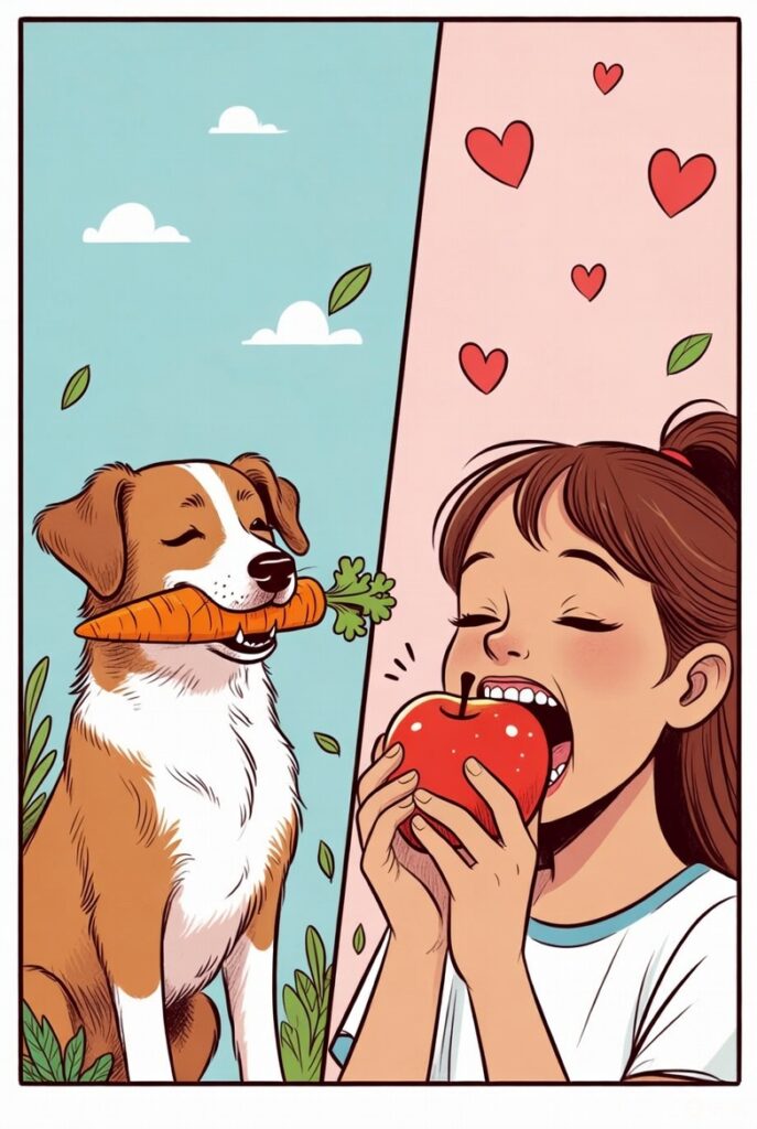 Anna is happy. She eats the apple. Max eats a carrot. They are both happy.
