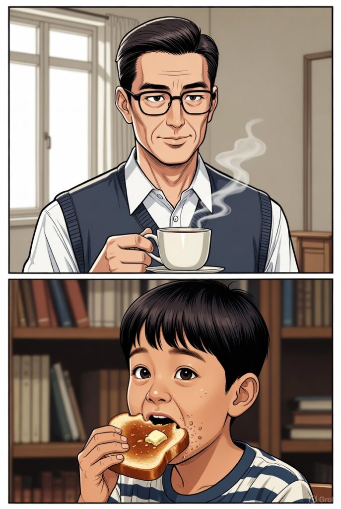 Leo is happy. He drinks the orange juice. He eats bread with butter. His best friend eats a small carrot. They are both happy.