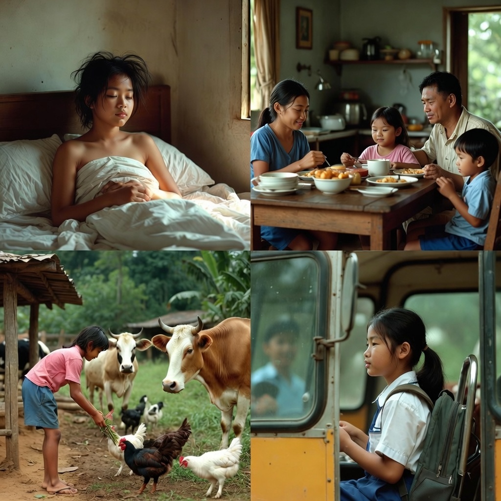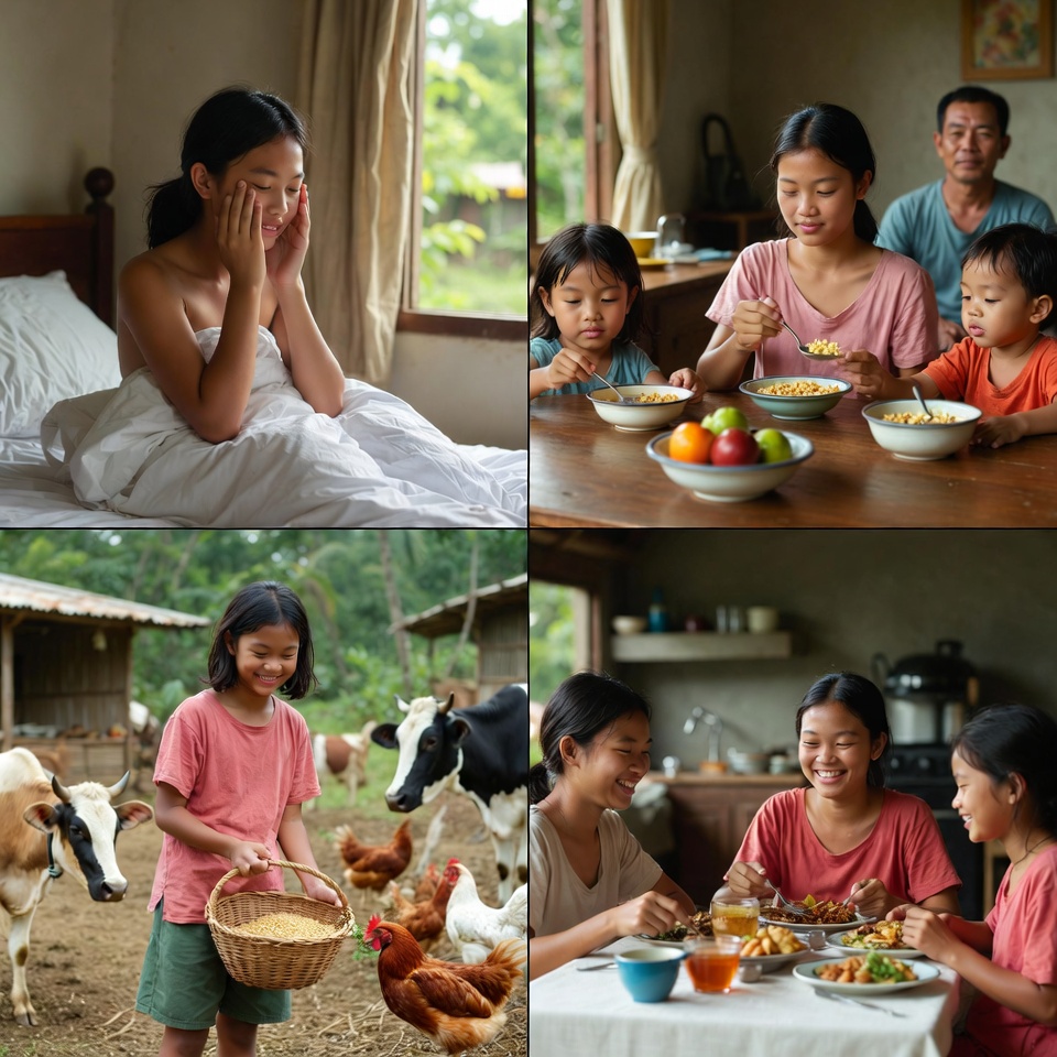 Every morning I wake up early and eat breakfast with my family. After breakfast, I help on the farm. I feed the chickens and give food to the cows.