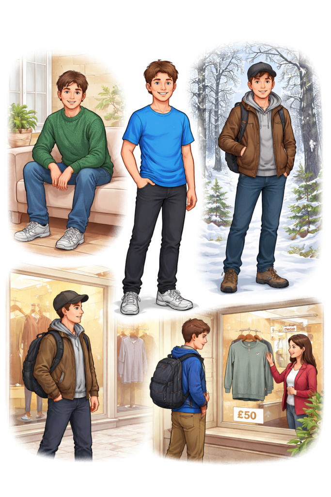 - Emma wears a hat and a scarf.