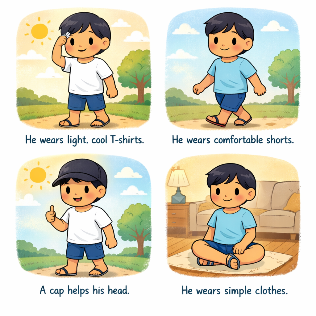 Kyaw wears simple clothes in summer.
