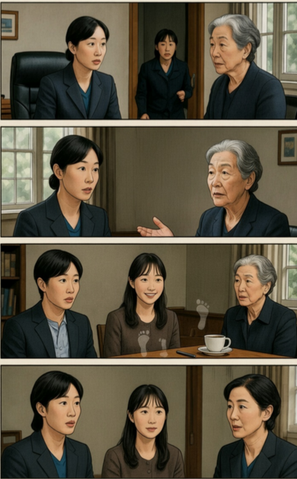 It is Monday morning. Detective Kim is in her office. Suddenly, Mrs. Lee comes in.